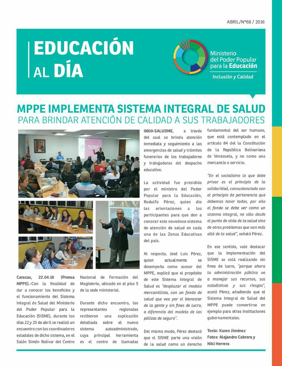 Caracas, 22.04.16 (Prensa MPPE).-Con la finalidad de dar a conocer los beneficios y el funcionamiento del Sistema Integral de Salud del Ministerio del Poder Popular para la Educación (SISME), durante los días 22 y 23 de abril se realizó un encuentro con los coordinadores estadales de dicho sistema, en el Salón Simón Bolívar del Centro Nacional de Formación del Magisterio, ubicado en el piso 5 de la sede ministerial.